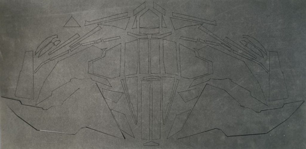 The sketch of feathers was transferred to the thermoplastic and cut out for further gluing. The cut 1 mm thik termoplastic turned out to be very flexible, which did not allow to make a rigid structure. We tried to fix this problem by increasing the thickness of the thermoplastic by another millimeter, but it turned out to be too heavy. The material of the feathers had to be changed. Therefore, it was decided to glue the EVA material and reinforce it with a U-shaped profile (6x6x6) by the sides, and the places for fastening the feathers with an aluminum strip. This decision made it possible to significantly reduce the weight, and also gave the necessary rigidity to the entire structure. For primer we used a mixture of liquid nails and water (1:1) and covered EVA with it. Also it was noticed that for a more stable color, you can not tint the places where the paint has peeled off, so feathers needed to be completely covered with color.