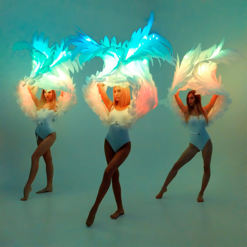 Such products as large LED and mirror wings, 3D masks and LED glasses, peacock fantails, bellydance wings and veils, light-up cage corsets are especially popular among event agencies as they can fit most sizes and can be combined in different variations for multiple shows.