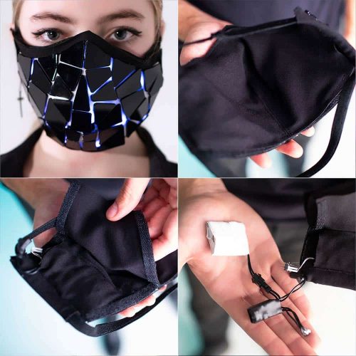 – This black mirror mask with LEDS comes in different styles: broken, asymmetrical, cracked mirror with tiles of different forms, and arrangement + you can choose between male and female sizes.