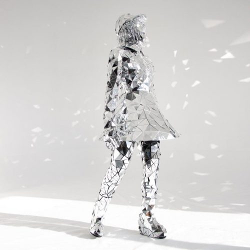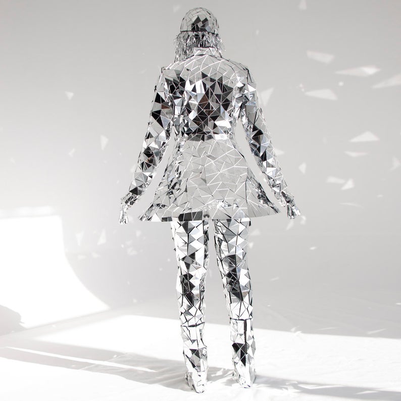 Mirror dance costume is made of acrylic mirror with mirrors of various shapes, which are assembled in a way that gives the impression of broken glass. This glass lady looks like real mirror and you can see your reflection in it, at the same time the mirror reflects well the lights of night and the sun’s rays, so you can use it at any daytime and any event – a meeting of guests, photo sessions, laser and light shows, dance competitions and etc. Mirror animation suits are safe, ergonomic, easy in use and repair.