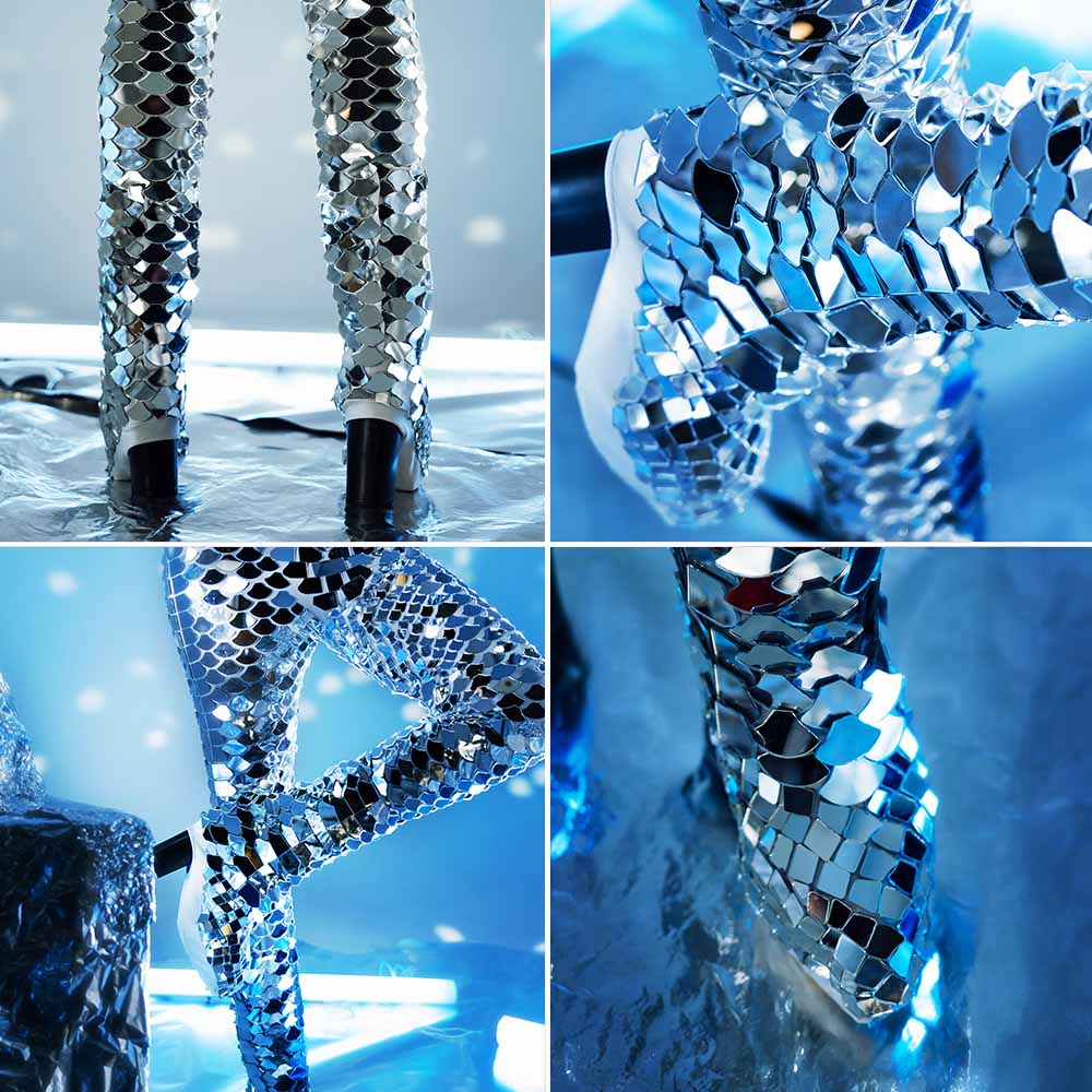 The accompanying mirror helmet completes the look, giving an otherworldly aura to your persona. Like the costume, the helmet is designed to reflect light, creating a continuous visual spectacle that captivates the audience from head to toe.
