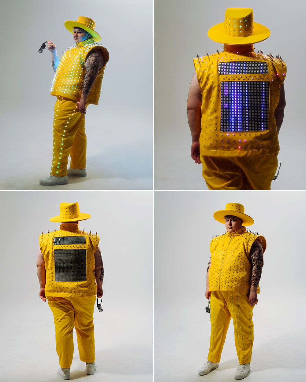 Rave Bright Men’s Costume glowing in the dark, the perfect outfit for standing out in a crowd! This eye-catching costume features a built-in screen that displays logos and animations, making it an ideal choice for festivals, concerts, or raves.